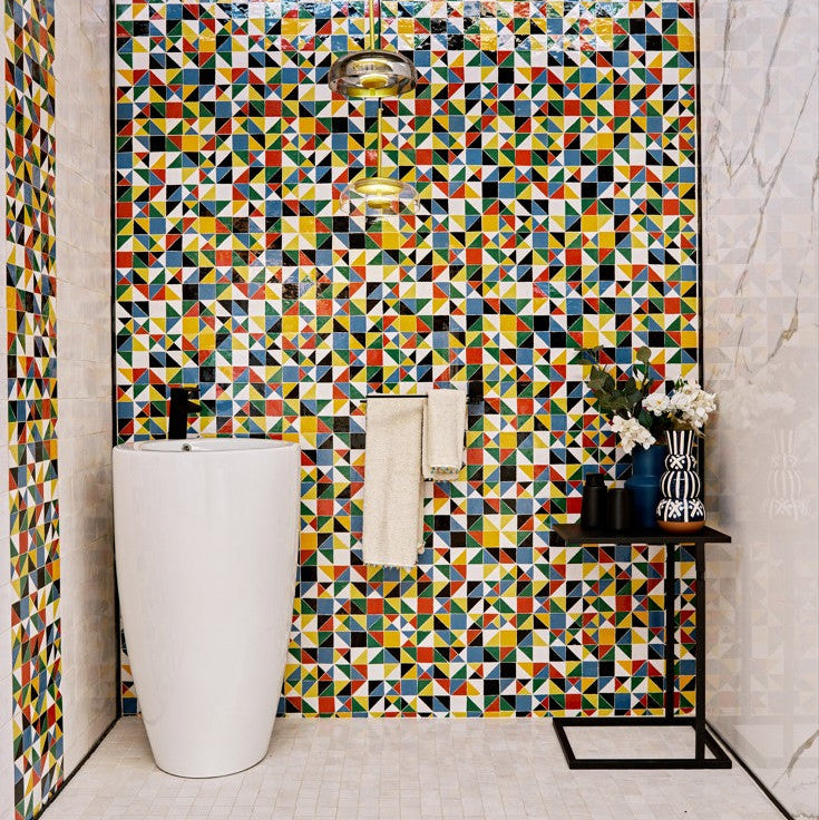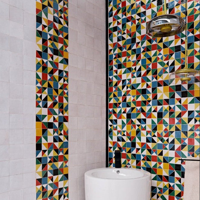 Africa, une collection de zelliges inspirée par l’Afrique voit le jour. Les ateliers Aït Manos embarquent cette fois pour un voyage graphique sur le continent mettant en lumière les racines africaines du patrimoine architectural marocain, emportant avec eux les teintes solaires et les motifs typiques du kente et du wax, tissus artisanaux africains.